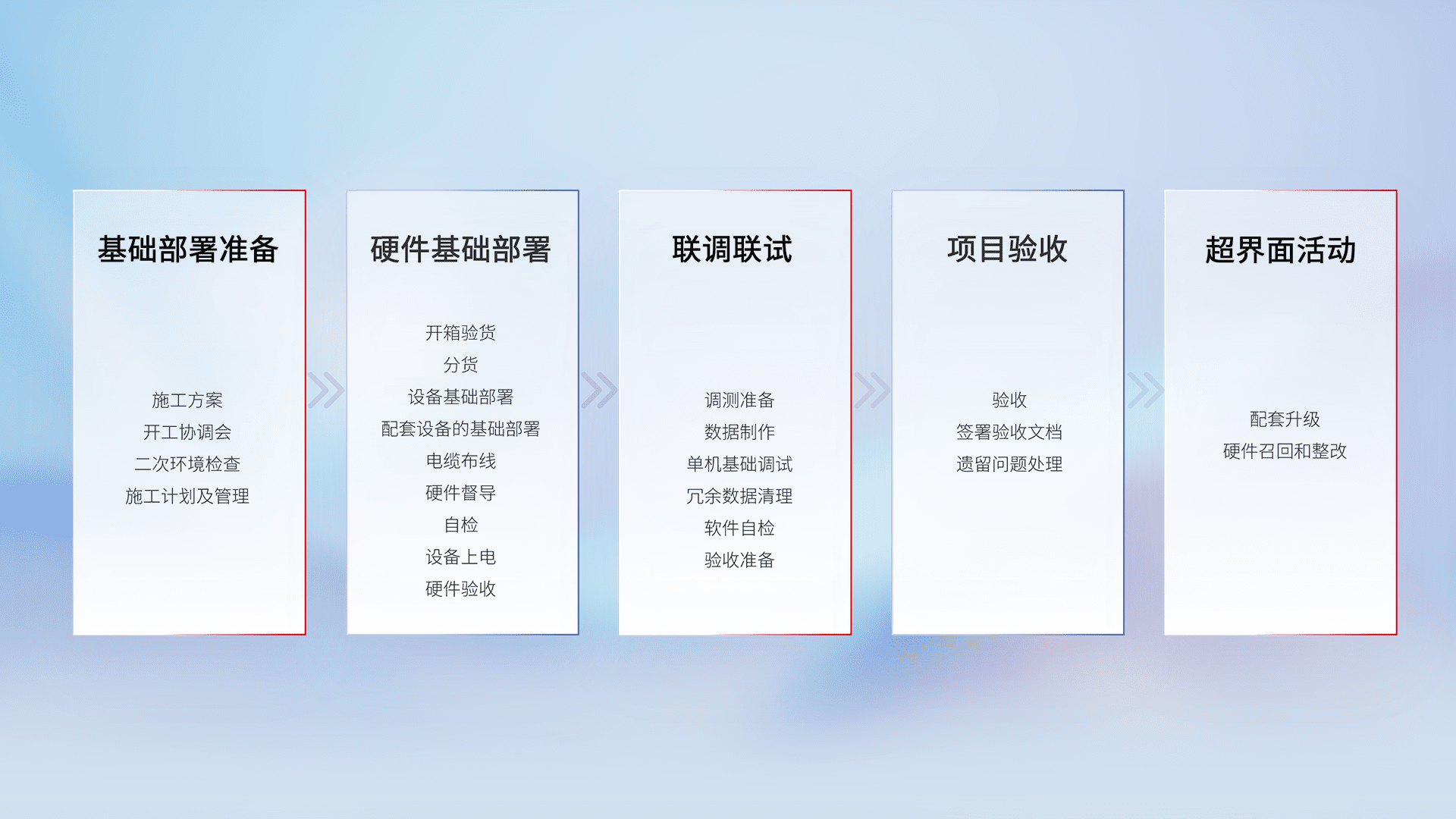 从基础部署准备、、、、硬件基础部署、、、、联调联试、、、项目验收、、越界面活动的全过程可追溯,,,保证施工质量和进度。。。